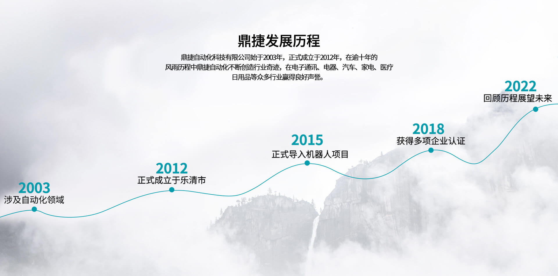 公司始于2012年,在逾十年的風(fēng)雨歷程中,不斷創(chuàng)造行業(yè)奇跡,在電子通訊、電器、汽車(chē)、家電、醫(yī)療、日用品等眾多行業(yè)贏得良好聲譽(yù)。公司坐落于浙江省樂(lè)清經(jīng)濟(jì)開(kāi)發(fā)區(qū),現(xiàn)有人員63人,擁有經(jīng)驗(yàn)豐富的工程技術(shù)研發(fā)團(tuán)隊(duì)11人,其中高級(jí)工程6人,具備本科以上學(xué)歷高級(jí)工程人員比例78%;同時(shí)鼎捷自動(dòng)化在蘇州,東莞等地設(shè)立分公司以服務(wù)目標(biāo)市場(chǎng)客戶,目前鼎捷自動(dòng)化已經(jīng)為下客戶提供配套自動(dòng)化解決方案:泰科、安費(fèi)諾、莫士、華為、中興、普聯(lián)、智英、意華、德豐、公牛、萬(wàn)事達(dá)、華豐、飛雕、普思、冠聯(lián)、俊朗松田、進(jìn)聯(lián)、高正、盛凌等。鼎捷自動(dòng)化專業(yè)從事連接器、開(kāi)關(guān)及相關(guān)電子、電器、五金、塑膠產(chǎn)品組裝自動(dòng)化定制、設(shè)計(jì)、制造、銷售。2012年,鼎捷自動(dòng)化正式導(dǎo)入機(jī)器人應(yīng)用項(xiàng)目,可為各類客戶提供電子、電器、汽車(chē)、五金、塑膠等集成自動(dòng)化智能組裝系統(tǒng)。